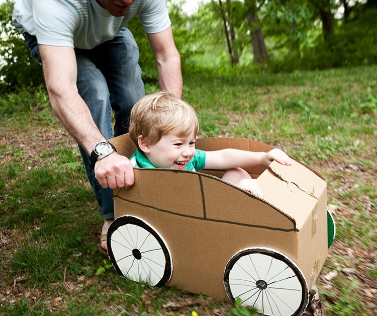 Since kids love to pretend, making a make-believe car is a great way to help them flex their imagination muscles while developing motor skills. Remove the top and bottom of a cardboard box. Leave the sides. Work together to decorate the box like a car. Cut holes in the sides large enough for little hands. Let them step in the box, put their hands in the holes, and pretend to drive.