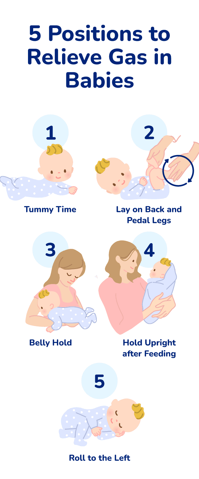 Some positions may work better than others for your little one, and you may have to alternate strategies. Be patient and take it slow as you work to find the ideal positions to help relieve your baby’s gas. If your baby continues to struggle with gas and fussiness, or they are not gaining weight or are experiencing additional issues such as reflux, diarrhea, or white, red, or black colored stool, speak with your pediatrician.